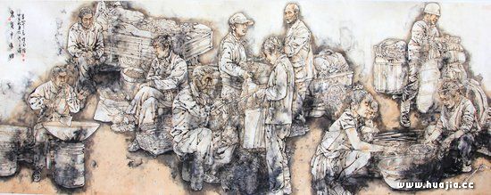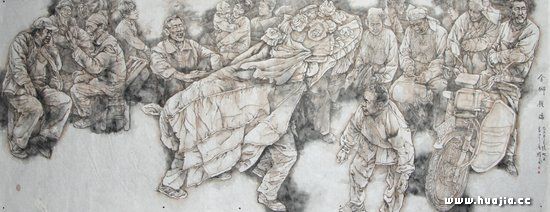 穿蓑衣的农民 中国75%以上的人口在广袤的田野上劳作生息,中国的社会结构、政治模式以及文化形态,都与其有密切的联系。农民的血液流淌在我们的血液中,扎根在我们的文化基因里,也反映在我们当下的现实中,姜先生的《守望》、《咱爹咱妈咱儿子》打动了很多人,原因也是因为他抓住了留守老人、留守儿童这一敏感的问题,以其特有的艺术的表现手法加以彰显。墨色浓重,单色的画面传递出悲伤和压抑的氛围,细腻的表情刻画和繁复的线条充满了内在的感染力,让人叹息。艺术家表现的农民形象已经远远超出了生活原型,他所代表的是我们身边的千千万万农民,是我们自己的生活,他们是和我们血脉相依的父母,是我们的遗落乡村的孩子!