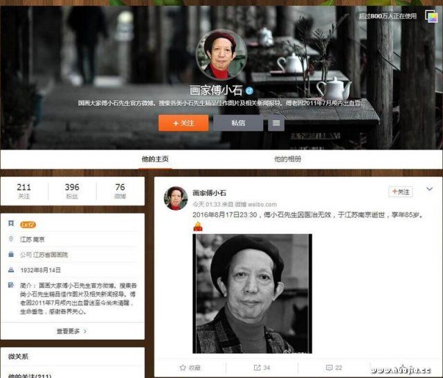 “傅小石先生因医治疗无效,于江苏南京逝世,享年85岁”,2016年8月17日晚23:30,傅抱石长子傅小石的个人微博发布了傅小石先生辞世的消息。在昏迷卧床五年之后,这位出身名门却一生坎坷的艺术家走完了自己生命最后一程,与其携手半个多世纪、相濡以沫的夫人王汝瑜虽也一身病痛,但仍在极度悲伤中坚持亲手操办傅老后事,在电话里王汝瑜表示:“请帮我们转告大家:傅老师的追悼会将于8月21日早上8:30在南京殡仪馆举行,家中不再另设灵堂,非常欢迎各界人士来送傅老师最后一程”。另悉,傅老生前所在的江苏省美术馆也在紧急筹划一系列的纪念活动。