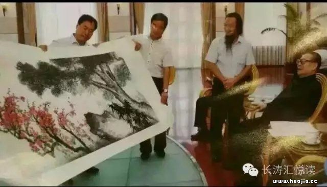 再看看作者简介吧: XXX(我真是不屑提这丫的名字),1963年生于浙江临安,1990年毕业于中国美院((聂注:这丫自己随后有称1989年就读于中国美术学院国画系,也就是说,在国美只呆了一年)。 现为杭州兰亭画院院长、中国民族书画研究院副院长、中南海紫光阁画院院士、中国文联书画艺术交流中心会员、中国美术研究院研究员、浙江省美术协会会员、浙江省国际美术交流协会理事、浙江省诗书画之友社理事、浙江省国际美术交流协会理事、浙江省花鸟画家协会会员。一级美术师,画家,教授(聂注:一堆裹脚布头衔,虚头巴脑、只有一个还能唬人的教授,还不可查考,不知道是哪里的教授。头衔写的这么详细,但关键处语焉不详,这是江湖混混的惯用伎俩)。 实际上,在简历里他就迫不及待地扯大旗当虎皮了:北京人民大会堂北厅收藏并悬挂《雍容华贵图》,及收藏《硕果》、《清新竹笋》、《国色天香》、《兰花》、《独悄一春》等六幅作品,全国人大会议中心收藏《牡丹图》、《万古长青图》、《松菊图》等作品三幅,中央军委八一大楼和军委办收藏《高风亮节》、《国色天香》等作品四幅,毛主席纪念堂收藏《古宅春韵》作品一幅,北京天安门城楼收藏《富贵长青》作品一幅。是全国第一位上中国政府网——新华网的著名花鸟画家…… 偶然得知,这位大师还曾害的赵老师损失了7万块钱。这是很多年前,赵老师去某中枢机关画画,对方领导指着墙上一幅画炫耀,同行的画家都含糊地应付,惟独赵老师忍不住说:这幅画太糟糕啦。这一句,对方领导立刻不高兴了,别人的稿酬都付了,惟独赵老师两幅画的7万块再无下文。 赵老师还挺高兴,认为省得这个钱脏了手。 那副让赵老师得罪了人的画,当然就是这位“大师”的了。至于赵老师是哪个赵老师,常看我文章的自然知道,我不想把赵老师的名字和这样的江湖混混扯在一起。 那位中枢机构的领导为什么这么推崇这个混混呢?原因是不是因为如下这张合影呢?我不知道。可是依傍政治领导人抬高自己艺术水准,这在我朝向来是很好使的招数。