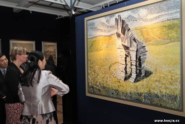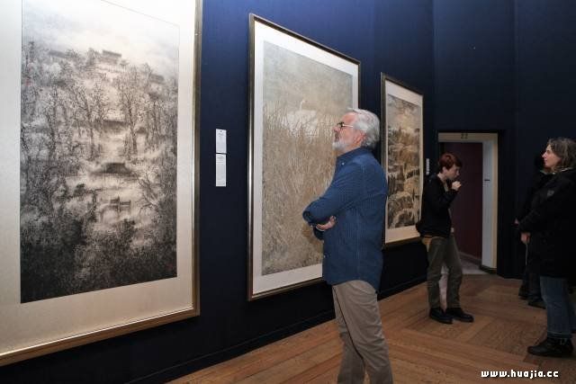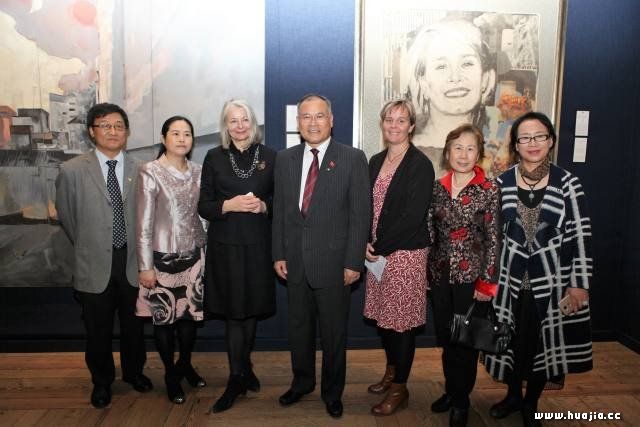 中国驻丹麦大使刘碧伟、希勒勒市市长多特·麦尔德高、丹麦国家历史博物馆馆长梅特·斯科尔德等出席了当天的开幕式。刘碧伟在致辞中说,中国当代美术作品展国际巡展向丹麦及欧洲观众集中展示了中国当代美术的创新成果,用艺术的方式表达了古往今来中华民族对“以和为贵”的诉求,同时积极推动中丹两国的艺术交流,顺应了中丹关系发展的良好态势。麦尔德高市长也表示,希望丹中两国今后在文化艺术领域继续加强交流和合作,助力两国关系迈上新台阶。 刘碧伟大使(中)与斯科尔德馆长(左三)、麦尔德高市长(右三)等嘉宾合影留念。新华社 石寿河 摄 此次展出的近40幅作品中,丰硕的中国画《原生态之冬后是春》,朱梅、周佰文的中国画《拾得秋色入画来》,詹国超的中国画《倾斜的大海之一》,王治平的油画《冬季》,朱锐的木刻版画《东川印象之二》等,都是讴歌季节自然原生态之大美状貌的作品;宋光华的中国画《绿色太行我家园》、赵新平的中国画《山乡初晨》、刘玉庭的雕塑《花·物语》,则正面表现人与自然的和谐之美;韩秀娥的中国画《同一片天空,同一个家园》、徐邠的中国画《栖息之地之一》、张龙的中国画《呐喊——消失的地平线》、崔俊的油画《蚀》、罗志楠的油画《筷子树》、刘根的版画《集结号》、彭伟的版画《围城之居》、闫然的水彩画《渡城》、张江的漆画《天籁》、薛骏猷的雕塑《采菊东篱下》等作品,则从警醒的角度呼吁爱护生态家园。 出席开幕式的中丹嘉宾欣赏中国艺术家崔俊-油画《蚀》。新华社 石寿河 摄 王静的油画《我的情绪传达》、王凯的油画《夜归人》、朱建辉的版画《状态·存在I》、陆增康的雕塑《失眠》等作品,聚焦社会快速发展下现代中国人的内心世界;而田林海的中国画《烟雨南孔庙》、王仁华的中国画《暗香浮动》,则对这一问题给出了答案:以儒家文化为核心的中国传统经典文化,以绵延至今的传统手工艺为代表的中国民间文化不仅是世界的,更是中国人永远充实内心的温暖的精神家园。 出席开幕式的中丹嘉宾欣赏中国艺术家田林海的中国画《烟雨南孔庙》(左一)。新华社 石寿河 摄 今年有巴西里约奥运会,而李爱国的中国画《辉煌——奥运之星杨霞》、王子奇的油画《和谐·中国奥运——首届奥委会成员》等2008年第三届北京双年展的作品,都从不同角度体现了追求和平竞技的奥林匹克精神。 早在四个世纪前,丹麦就已经与亚洲通航;200多年前的中国清朝嘉庆年间,中国的陶瓷、丝绸、茶叶等经由海路流通到丹麦。而建于公元十六世纪的菲特烈堡又称“水晶宫”,曾是丹麦王室的行宫,自1878年以来一直作为丹麦国家历史博物馆。 而今,由中国美协主办的此次展览,在费特烈堡为中丹两国文化交流增添了浓墨重彩的一笔。中国美术家们从现实角度观察社会变迁,在精神层面感悟世间百态,生动地描绘了当代中国“机遇与挑战并存,喜悦与艰辛交织”的全景画卷,并向世人传递一个永恒的主题:向往人类和平,关爱地球家园。