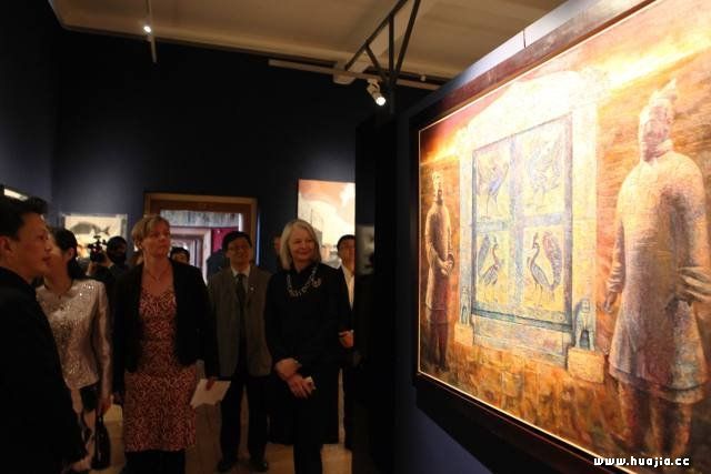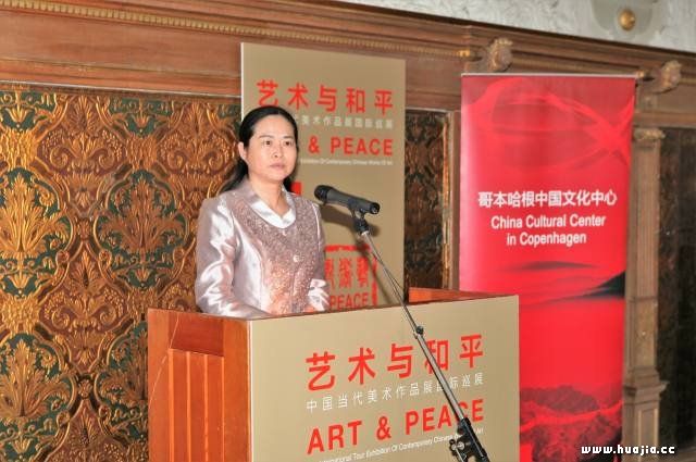 由中国美术家协会主办的“艺术与和平——中国当代美术作品展国际巡展”赴丹麦展,14日下午在希勒勒市的菲特烈堡丹麦国家历史博物馆开幕,“童话王国”的观众得以从艺术家的作品中一窥中国人爱好和平、“以和为贵”的精神世界。来自中国历届北京国际美术双年展的近40件中国佳作来到丹麦,以“艺术与和平”为主题,透过中国画、油画、版画、水彩画、漆画、铜雕、综合材料等多种艺术形式反映出“以和为贵”的中华民族对和谐美好生活的热爱以及对人与自然关系的思考。 出席开幕式的中丹嘉宾欣赏中国艺术家方向晖的油画《中华卫士》 新华社 石寿河 摄 中国雕塑家李富军与前俄罗斯美术家协会主席阿尔伯特·恰尔金以及雕塑家瓦连金·斯维什尼可夫合作的雕塑《友谊和平天使》、方向晖的油画《中华卫士》、旅英华人艺术家曲磊磊的综合材料绘画《美丽莎——一个“9·11”受难者》是本次展览的点题作品。 中国美协副秘书长陶勤表示,中国美协始终把构建和谐世界的理念作为策展思想,通过当代艺术展览,促进世界和平与和谐以及社会进步和人类幸福。 陶勤说:“当年,欧洲文艺复兴运动与古丝绸之路上东西方文化交流曾相互渗透;今天,在21世纪的新丝绸之路上,关注和平的艺术交流也肯定能为我们的世界带来更多童话般的安宁与美好。” 中国美协副秘书长陶勤致辞。新华社 石寿河 摄