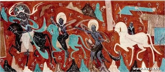 《捣练图》局部 这种画面构图方式在敦煌石窟本生故事画中常见,特别是睒子本生图(北周第301窟),还有九色鹿本生(北魏第257窟)。这两个故事与“捣练”故事相较都更为完整而复杂,发端由横向构图的两端开始,两条线索相向而行在画面中间迎来高潮(一个结局)。这是典型的“组合画式”,可视性比较强,在观看时视点会首先落在最富有感染力的地方,也正是画面中心所在。后来又发展出来的“连环画式”的变相,被认为相比之前的“单幅画式”变相的表现形式,可以使创作者更加从容地选择故事情节,然后将发生于不同时空中的情节在画面中有秩序地表现出来,叙事性特点十分明显,增强了对整个故事内容的表现。东南大学副教授于向东认为,古代印度、中亚等地的石窟变相中连环画式并不多见,单幅画式、组合画式则是最常见的表现形式,而比较成熟的连环画式变相是佛教传入中土后的产物,在其产生过程中较多吸收了中土传统卷轴画和汉画像石的艺术经验。