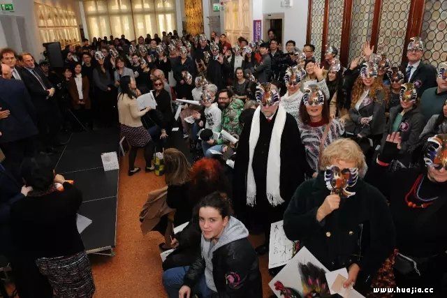 ▲适逢威尼斯狂环节,所有观众戴上由韩美林公鸡图特制的面具集体合影