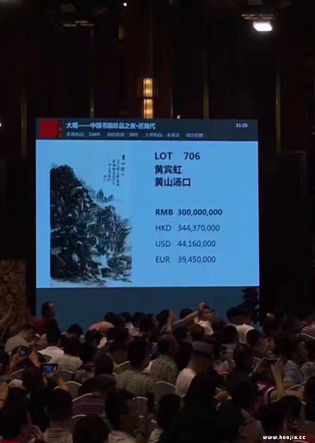 0706号拍品黄宾虹《黄山汤口》在拍卖之前拍卖公司给出的市场估价为8000万元-1亿2000万元,根据此估价,我们似乎已经预见了黄宾虹作品在今春的拍场上会有所突破。此件拍品以7300万元起拍,竞拍现场十分火爆,经过数轮激烈竞价,此拍品最终以3亿元落槌,加佣金最后成交价为3亿4500 万元,刷新了黄宾虹作品在艺术品拍卖市场中的价格纪录,打破了其曾在2014年在嘉德创下的6267.5万元的记录。在作品进入艺术品拍卖市场24年之后,黄宾虹终于突破亿元大关。