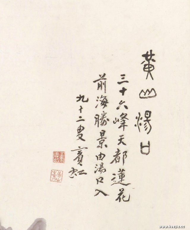 右上角题字 细节图 黄宾虹作品进入艺术品拍卖市场的二十多年间,其价格始终在不断上扬,从万元、百万元飙升至千万元,但始终未曾突破亿元。因此曾有人感言“黄宾虹目前的市场价格与其在美术史中的地位并不相符”的声音 ,市场人士普遍认为其价值一度被低估。虽然艺术品的市场价格并非其艺术价值的全面阐释,但往往有时代标志的艺术大家的作品都有一个相对的市场认可度。 黄宾虹作品在1993年就出现在了内陆的拍卖市场中,宾翁与其他艺术家集体完成的成扇在1993年上海朵云轩首届拍卖会上以2.79万元人民币成交。1994年其个人作品《水墨妙境山水图》在中国嘉德春季拍卖会以6.05万元成交,此作品为3平尺左右;同年其作品《绣壁万仞》在上海朵云轩拍卖会以38.5万元成交。1995年《巨幅山水》在中国嘉德秋拍中以264万元成交,此价在当时的中国艺术品拍卖市场也称得上是一个小高峰。2008年其作品《山川卧游卷》在上海朵云轩拍出了1288万元,首次突破千万元大关。2014年中国嘉德春季拍卖会中黄宾虹的《南高峰小景》以6267.5万元成交,此价格一直保持到《黄山汤口》刷新价格纪录之前。黄宾虹作品在进入艺术品拍卖市场后,大致经历了价格崛起期、价格突破期、价格瓶颈期以及现在的破亿元现象。这是艺术品拍卖市场不断完善的结果,也是其艺术价值被拍卖市场不断认可的结果。笔者以为在此之前,黄宾虹作品一直为突破6267.5万元的价格纪录,与市场上藏家惜售心理、精品力作多藏于各大博物馆也有较大关系。