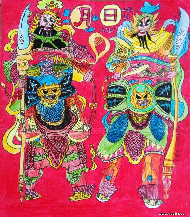 《中国红》 常博翔 10岁 小作者有很好的观察力,具备了一定的造型能力,用较为繁复的线条勾画出了两个威武的中国传统门神形象。(何琳)