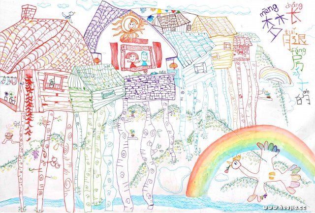 《长腿房子的梦》 叶伊梦 6岁 小作者十分憧景田园生活,喜爱像小鸟一样有一个快乐甜美长着长腿的小木屋,伴随自己走近大自然梦幻着美丽动人的童画世界,向花一样茁壮成长。(周殿宝)