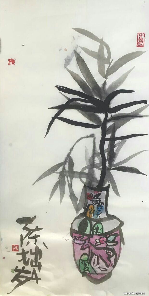 《清供图•竹》 陈拙 4岁 作者人小心大,让作品既有中国水墨画的意味,自己力图有办法式的用笔、用墨、用水、用色表现,又体现了儿童天然式的大气与舒展,这样的作品,对促进孩子自己从小感觉中国传统绘画艺术是有积极价值的。(梁玖)