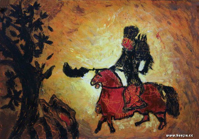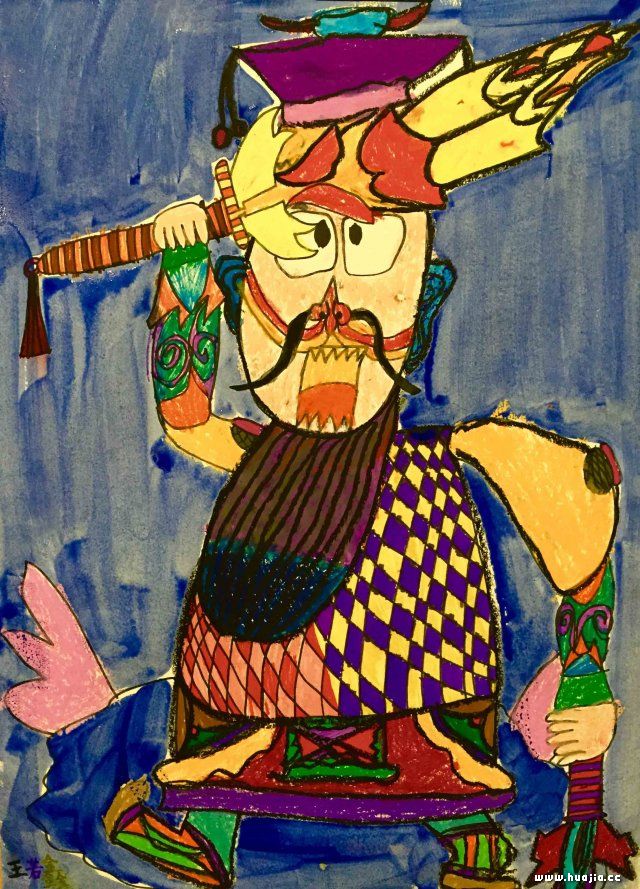 《单刀赴会》 金宇辰 8岁 给一个八岁的孩子讲文化传承责任,话题过于沉重,对于传统文化的学习也不仅仅只有书本和文字。如果用传统的皮影做道具给孩子演一出三国里的经典故事《单刀赴会》,那他记住的就不仅是《单刀赴会》中那位义不负心泰山重的英雄豪杰关羽了。这幅画中从造型的剪影效果和单纯色块表现出的立马横刀豪气冲天的关羽人物形象,以及小作者稚拙的线条笔触表现出的形象细节,似可见民间玩具和皮影的影响。(何琳)