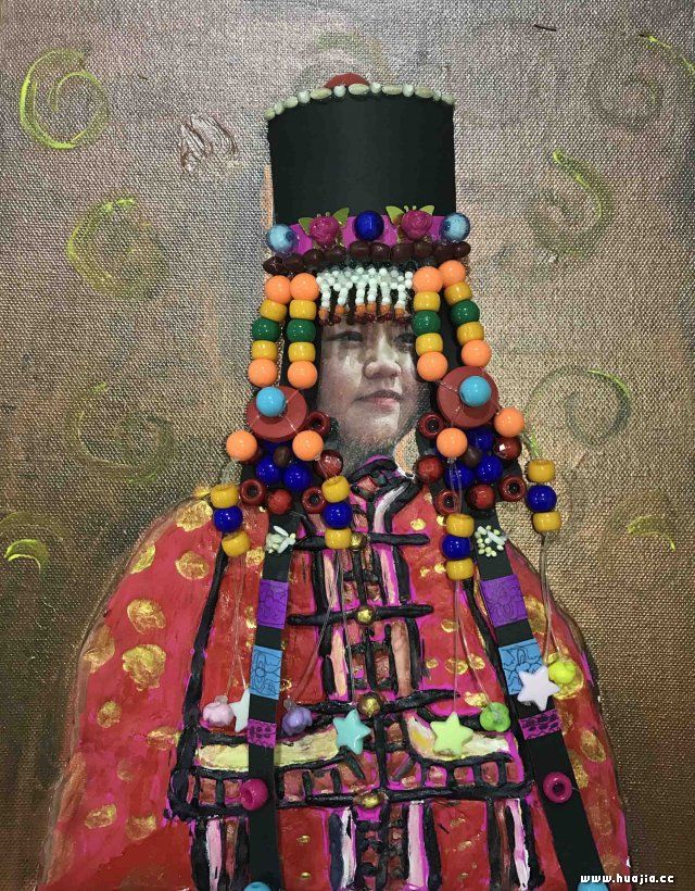 《女孩》 郭易维 6岁 作品利用综合材料手法对主体人物进行了创作,反映出藏族女孩爱美的天性,折射出藏族女孩与现代都市中女孩审美情趣的对比,突显人物更加生动而神秘。(周殿宝)