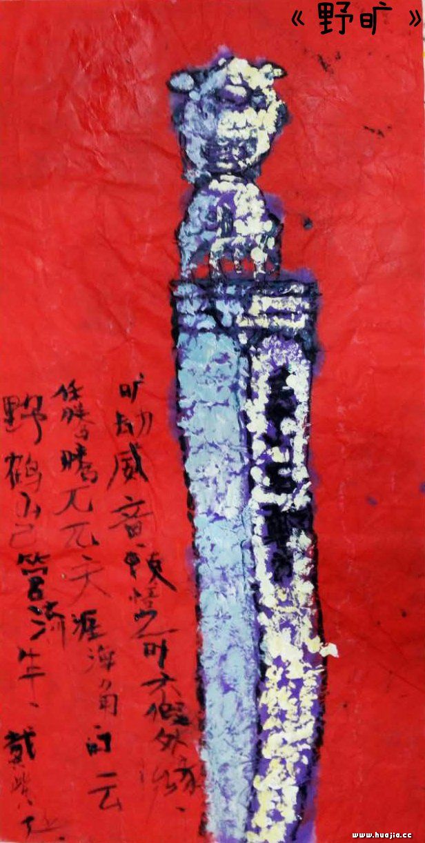 《旷野》 戴紫庭 8岁 这件作品构图新颖,一根“泰山石敢当”顶天立地,红色的背景上三行文字与立柱造型相呼应;揉皱技法的皮纸正反施色,墨线勾勒,用笔干练肯定,表现出岁月的沧桑感。一柱诉说千古事,自由宽阔的视野,悠悠往事慢慢浮现……让观者细细品味。(陶涛)