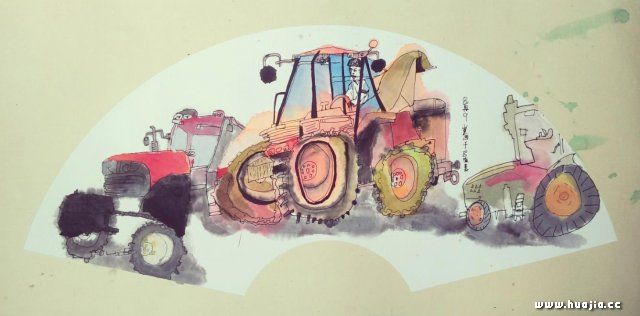 《开工吧》 包冉 9岁 本作品利用扇面的形式绘制丰收繁忙的景象,作者巧妙地利用收割机等画面符号表达自己心中收获的寓意,线条与色彩搭配合理,主题突出。(郭德岺)