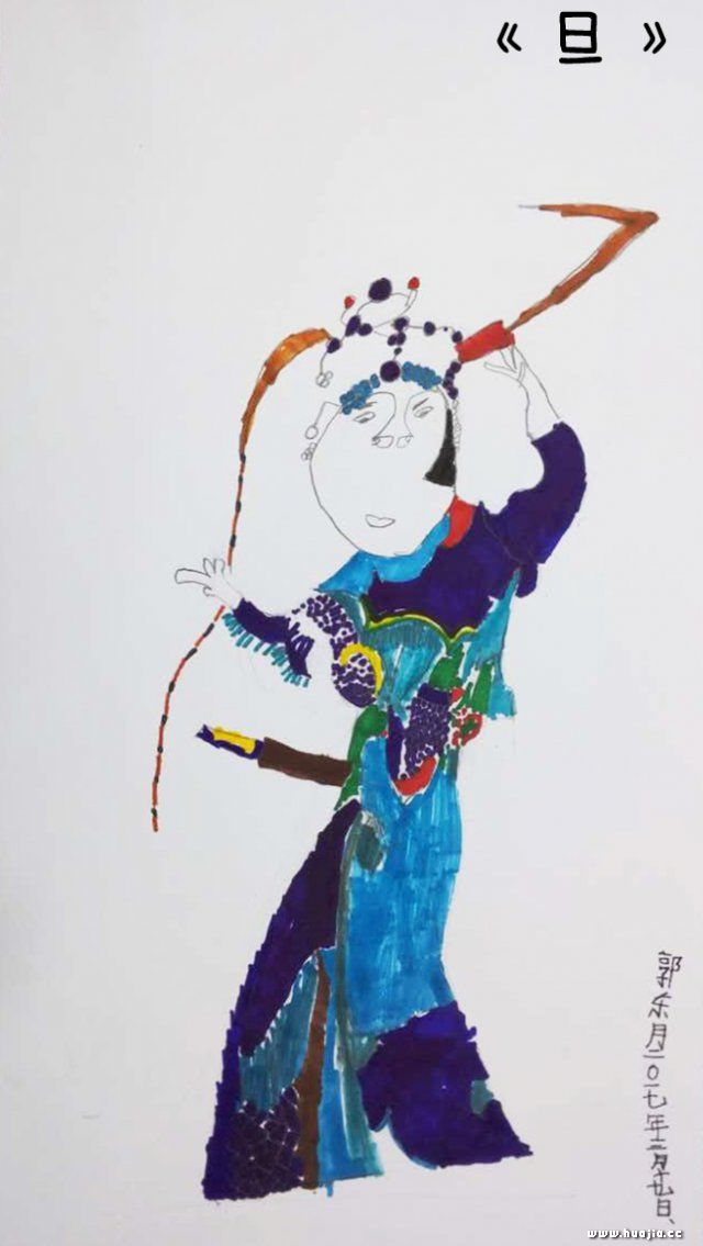 《旦》 郭东月 6岁 整幅画面犹如戏剧舞台,刀马旦的服饰、神态源自儿童独特的表现方式,扮相虽未施粉黛,但眉目间情意已至。人物舒展的动作、沉醉的姿态调动了画面中的情绪,唤起观看者自由无羁的想象力。能有如此的感受力,想必小作者喜欢看戏并善于表达内心的情绪。(陶涛)