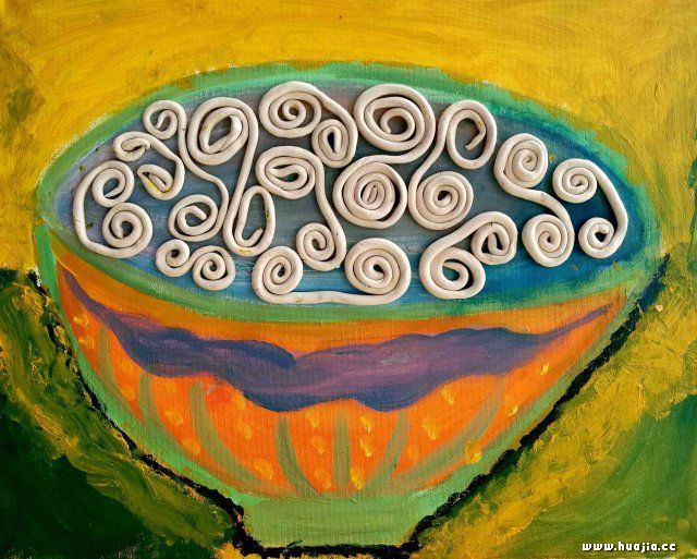 《大碗面》 何心怡 8岁 儿童的创造力应该在生活中发展。一碗普通的面,因为用了不一样的材料来表现,使画面平添了许多童趣。(何琳)