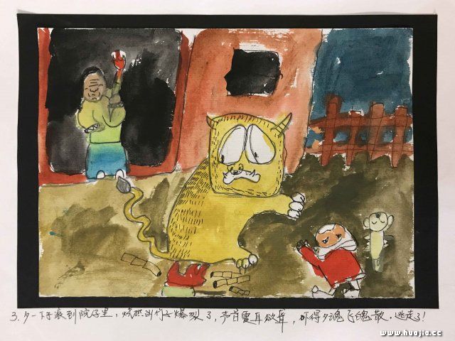 《除夕的故事》 谭信屹 9岁 作品较好地反映了小作者自己对中国传统“除夕”主题的故事想象化视觉表达,并让人们在连续1—4的连环画故事与表现中,知道了古老的中国魅力。(梁玖)