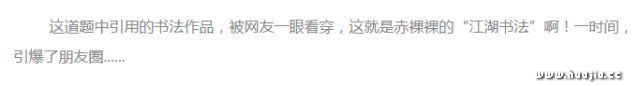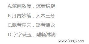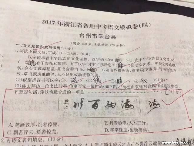 就在昨天,一则消息引爆朋友圈,内容为2017年浙江省各地中考语文模拟试卷(四)台州市天台县试卷。其中,第一大题语文知识积累和运用中,第1题的第(2)小题:你去拜访一位书法前辈,他刚写完一幅作品(如下图)。你想由衷地对这幅作品进行赞美,下面四句话,你认为合适的一项是()。