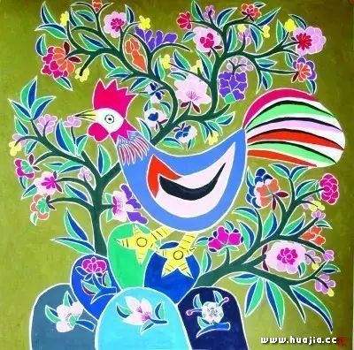 花与鸡 阮四娣 在作品的创作过程中,许多农民画作者全家总动员,画乡齐发动。创作语言和题材的丰富体现了当代农村文化生活的多样性。水粉画、油画、国画、版画、漆画、唐卡等多种样式,不拘一格,洒脱自如,呈现出丰富的审美意象。其中,上海金山农民画体现了海派艺术的色彩和传统;广东龙门农民画体现了广府文化的影响和客家文化符号的多样性;浙江舟山渔民画富有现代气息和浪漫色彩。还有贵州龙里巴江乡平坡村的农民画作者从当地节日庆典中汲取艺术元素,绘制鱼纹图腾造型,人物形象富有张力;山东日照的作者将“过门贴”的形式语言运用到农民画的人物造型中,色彩鲜亮夺目。这些作品扎根现实生活的土壤,艺术主题和语言都来自日常生活,质朴醇厚,充实饱满,具有浓郁的乡土气息,充满了泥土的芳香。可以说,农民画创作队伍的成熟、壮大和繁荣,既是民间文化生态的反映,也是民间文化自信的体现。