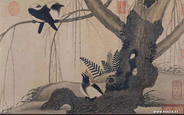 宋徽宗的署名绘画很多, 但几乎只能保证签名是真迹。 而上博这卷柳鸦芦雁图的“柳鸦”部分, 大多数鉴定家都肯定是徽宗亲自画的, 这非常罕见 这卷徽宗亲笔画作,是上海博物馆的大名品,平时难得一见,
