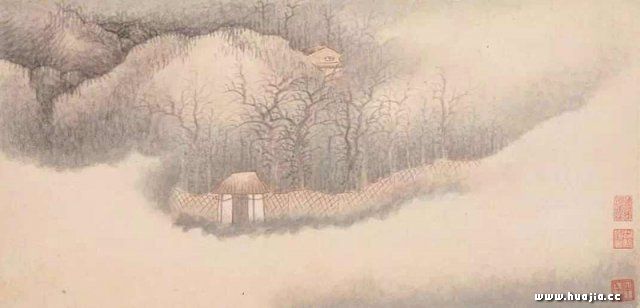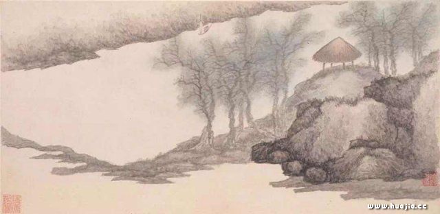 清 龚贤 《山水八段图卷》 龚贤是金陵八家的代表人物, 画的大都是南京一带的风光。 他的作品有白龚和黑龚两种样貌, 黑龚墨色淋漓、层层积染, 这卷属于白龚,干湿皴染相结合, 画意古朴淡雅、清新明净, 山石的受光面留白。