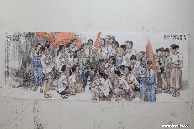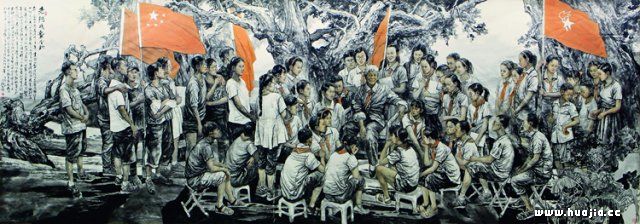 进行创作 多年的创作经验让我深知,只有带着感动创作的作品,才可能有震憾人心的力量。“八粒蚕豆过草地”的故事、“鲜红的红领巾”宣传漫画;温暖的“幸福学习小组”,每月500元购买青少年科普书籍,这一件件具体而微的小事,无一不诠释着龚全珍艰苦奋斗、一心为公、无私奉献的精神与信仰,这精神与信仰是如此温润、具体、可感,它始终保持着与人民群众的血肉联系,始终腾跃着不懈的生机与活力,让我深切感受到了一个真正的共产党人对自身使命与信念的永恒坚守,同时在心里也慢慢明晰了作品所要采取的艺术表达形式。 首先,我将作品主题聚焦于“龚全珍与青少年们”,一个国家的强大与否,取决于这个国家的青少年的素质的高低,而做好青少年的信念培养与道德传承,这正是龚全珍一生的使命与追求,也是最具表现力、感染力的创作题材。其次,在整体设计上,我通过综合分析作品中“老”与“幼”,“单人”与“群体”、“过去”与“未来”等之间的逻辑关系,努力实现诸元素的调和。如画面布局上,采用浮雕艺术常用的群像式布局,即以龚全珍为核心,以不同年龄的青少年为映衬的方式来构建,使作品整体形成疏密有致,动静结合的格局,达到“孤群相和”;服饰设计上,我一方面通过衬衣、长裤、布鞋等,勾勒出龚全珍一贯的平实与朴素,同时另一方面,又通过青少年们多样化的夏季着装突出时尚与健美,以两者之间的反差为画面增加了视觉冲击力,实现“朴华相和”;在人物动作设计上,因龚老今年已94岁高龄,做幅度太大的肢体动作已不适宜,因此我将龚全珍全身像设计为端坐在圈椅上,为大家娓娓诉说,开展言教。周围青少年静静聆听,体现“动静相合”等。第三,创作过程中,我力求通过细节刻画来引人联想,从而即小见大,折射出人物的精神乃至时代的内涵。比如,画面中的龚全珍老人,她满头的白发和脸上、胳膊上密布的皱纹昭示了她一生所经历的沧桑岁月,而同时嘴角跳动的笑意与脖子上鲜艳的红领巾却又让她充满了一种年轻的活力。此时龚全珍老人口齿半露,正在为孩子们娓娓讲述着什么。龚全珍老人此时的眼神感慨而复杂,我希望大家能通过她的眼神,读出她深深的追忆与殷殷的期待。而此时身侧的听众们──他们中有小学生、有中学生、有教师等,他们人数众多,或前或后,或坐或站,或远或近,大家环绕在龚全珍老人身边,都在静静地聆听。他们的表情亦是复杂多样,他们中,有的聚精会神,心无旁鹜;有的点头微笑,心驰神往;还有的低头不语,若有所思,但无一例外的,大家都被龚全珍老人富有感染力的话语所深深打动了,在人群右侧最外围有两个学生此时正回头朝向他们的老师,神情惭愧而羞涩,这让人不禁联想到此时老师正在不失时机地借龚全珍老人的讲述对后进的学生进行鞭策,这一充满温情的“小动作”也让画面在庄严划一的同时增加了一点灵动的俏皮。第四,环境设计上,为了强化人物画面的感染力,我特别在龚全珍老人背后设计了江西莲花地区特有的香樟树,粗大而枝繁叶茂的香樟树,一方面体现了龚全珍老人所处南方地区良好的植被特色,另一方面也象征着龚全珍老人生命不息、奋斗不止的老而弥坚的革命斗志,此外,还喻示着中国优良的革命传统正如这老树抽新枝一样,必将不断推陈出新、生生不息。而画面中青少年们胸前鲜艳的红领巾手中的飘扬的旗帜也是整幅作品中唯一的艳色,鲜红的颜色也恰如遍地的燎原之火与熊熊燃烧的火炬,与龚全珍老人的宣讲相互响应,进一步强化作品所要表达的理念与主题。第五,在色彩设计上我大胆尝试了水墨设色表现,除几种必要的色彩外,画面中没有再出现其他色块。在细节处理上,我通过皴擦着力强化人物造型的质感,同时使用浓墨表现人物躯干和衣饰纹理,在人物面部表情方面精微刻画,而光影则通过适度的泼墨和概括来尽可能表现出质感,烘托人物的精神世界。