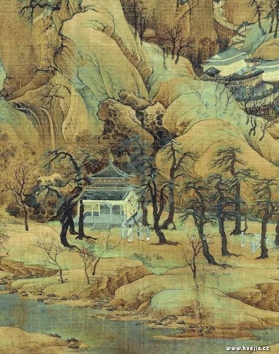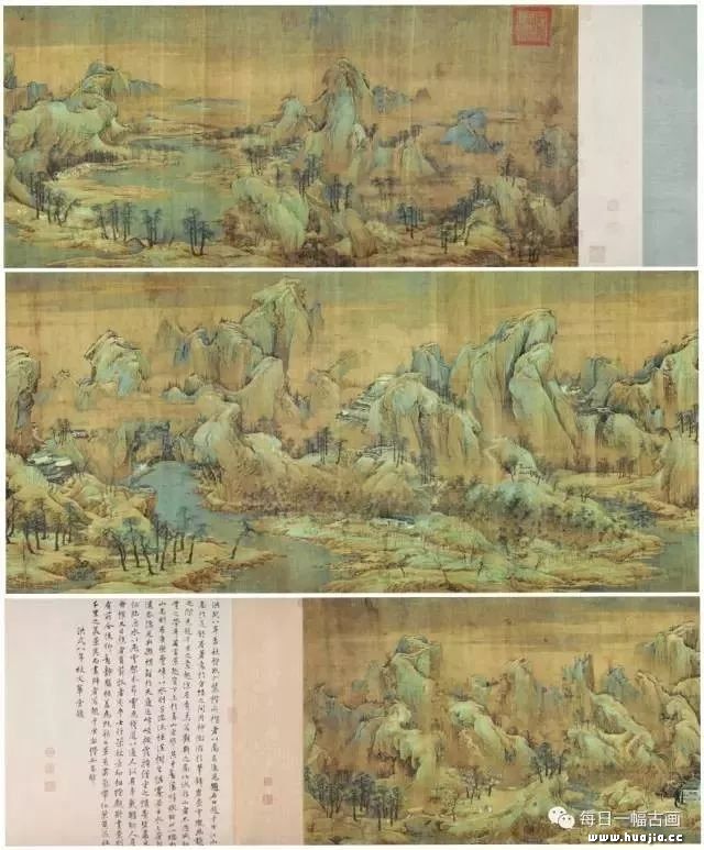 的确,《江山秋色图》卷作为一幅流传至今的宋代青绿山水画真迹,在中国的青绿山水画发展史上有着很高的艺术地位。现在,这幅《江山秋色图》,和传为宋代“希孟”的《千里江山图》,都正在故宫午门的“千里江山---历代青绿山水画特展”上展出。有兴趣的朋友,可以去故宫午门展厅近距离感受历代青绿山水画的艺术魅力。