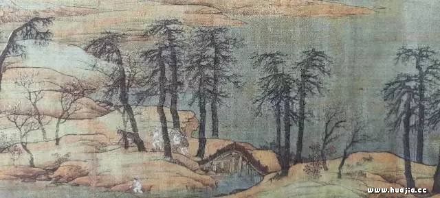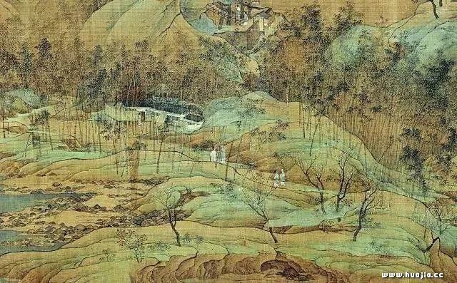 至于画中的点景人物,更是精彩纷呈。有车马行旅、登上越岭者,有闲步竹径、放牧林间者,有荡舟江山、待渡岸际者,有垂钓水滨、倚门遐思者,有居山顶高楼、侃侃而谈者。人物比例虽然很小,却须眉隐约可见。画法双勾后点染青绿、白粉。笔简形具,栩栩如真。