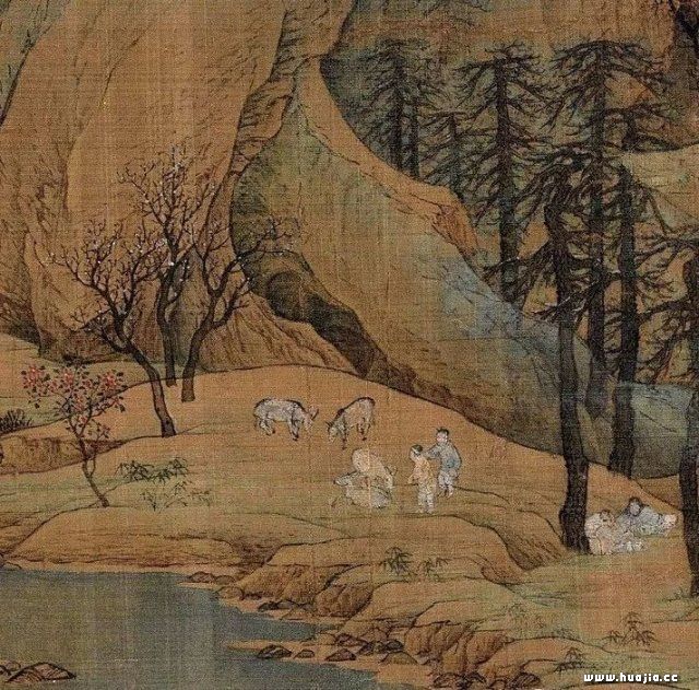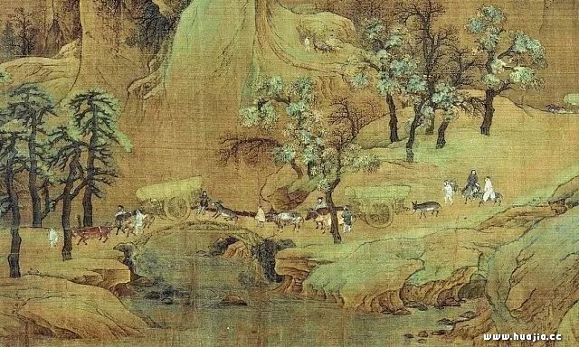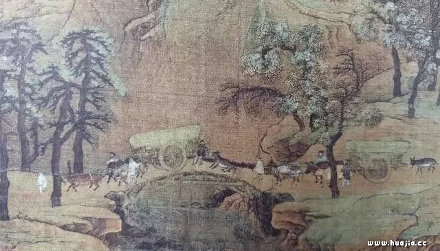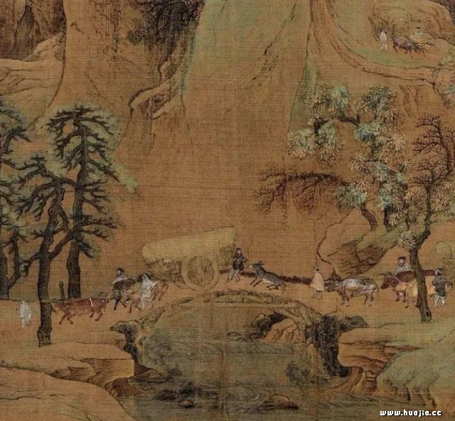 车马行旅过桥,画的非常生动传神。其中桥上车后的那头毛驴,画的尤为生动。驴子往后倒退,不愿上桥,主人紧拽缰绳。整个行旅,无一处不精致传神。足以看出画家高超的绘画表达能力和对生活的观察之细致。