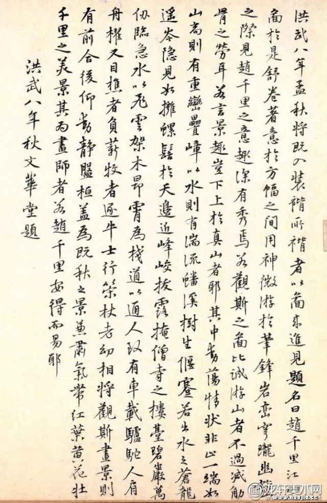 将青绿山水,融入“士气”,是赵伯驹艺术的重要特点。 赵伯驹以水墨为重,以青绿为辅的画法,似乎也比较适合文人画家之理念。自赵伯驹开始,水墨晕染的青绿山水代有传人,并不断演绎革新,逐渐形成了“小青绿山水”体系,沿袭至今,成为山水画的水墨、浅绛、青绿三大形式之一。 元代著名山水画家黄公望曾跋其《上林图》说:“此卷精细入神,……其山川深秀,树木丛密,丘壑有情,人物勇健,羽鳞生动,旗帜鲜严,舆马森然,台榭壮丽,路径分明,此千里(伯驹)聚精会神之处,余每一展视觉神思飞扬,欲搦管摹其一丘一壑,如执千钧,徒生羡望。”明代文徵明曾赞云:“艺林中有千里(伯驹),如山中有昆仑。”董其昌虽将其贬入“北宗”,但也不能不称其“精工之极,又有士气”。足见赵伯驹的绘画对后世影响之大。 赵伯驹和其弟赵伯驌在唐李思训父子的基础上,总体上保持住青绿山水的特点,而将水墨山水画和“文人画”的理论引入其中,并加以充实。他们在青绿山水中,借鉴了水墨山水画中的皴、擦、点、染,使塑造手段和画面更加丰富多变。二赵改变了李氏父子山水画中只有勾、描的单调局面,加入了墨韵神采,发展到了以墨色控制色彩,在墨韵中追求色彩的变化,把南北二派的画法合二为一。他们将文人的雅逸之气,倾注于青绿山水画中,使得青绿山水获得了新的发展。赏读《江山秋色图》卷,其中的“士气”和文人画意味,让这一幅宋代青绿巅峰之作,在精致和旖旎的表达中,充满着穿越时空的艺术魅力。 【 附】《江山秋色图》卷钤有清内府“乾隆御览之宝”、“石渠宝笈”等印,以及梁清标鉴藏印。尾纸有明洪武八年(1375年)朱标题跋。 图为青绿设色。画中有青山碧水、殿宇村舍,栈道、桥梁穿插其间,又有苍松翠柏,茂林修竹,移步换景,令人玩味不尽。山石用小斧劈皴法,再施以青绿重色;树木、建筑刻画细腻精谨,点景人物描绘细致入微。整幅作品布局宏大,细节丰富,色彩浓丽而不失清雅,刻画精细而不琐碎,带有宋代画院气派。 《江山秋色图》之朱标题跋
