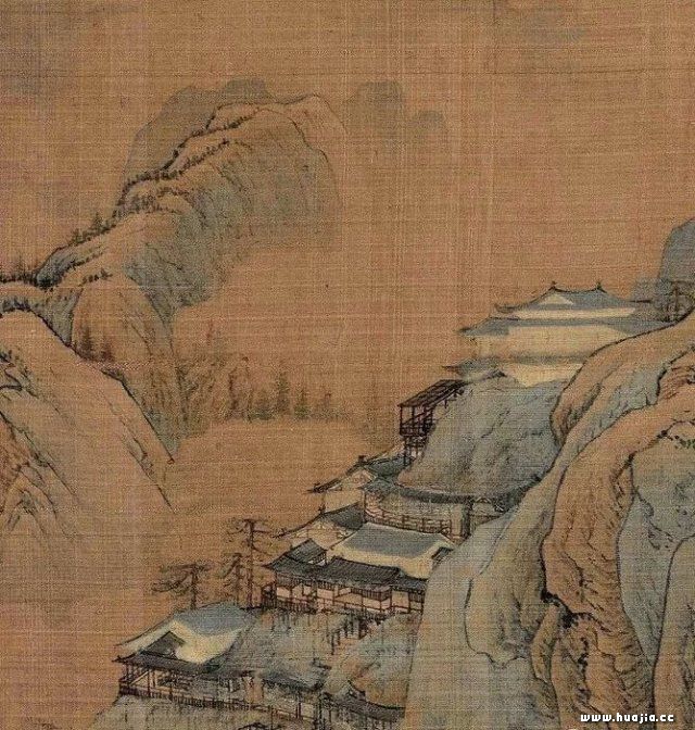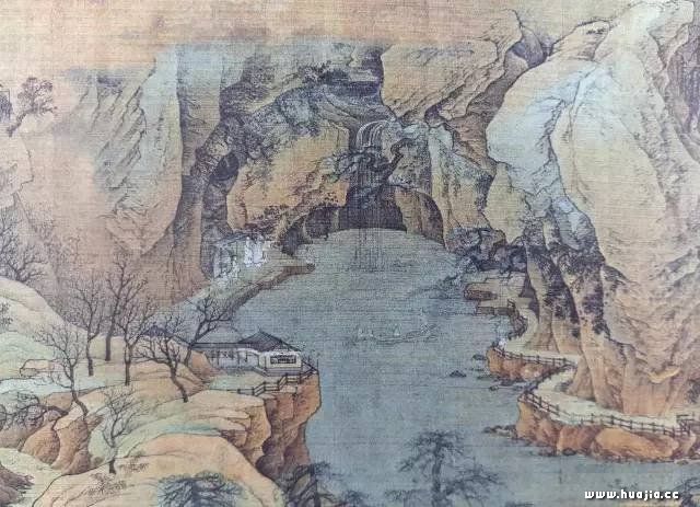 河水,小桥,瀑布、风雨桥、栈道、客栈、山里人家。典型的北方精致。秋水漫漫,别样美丽。近景的河水拱桥上有行旅赶着驴子,刚刚走过何桥。按照山峰的脉络,他们似要通过有风雨桥和栈道的两山之间的关隘,翻越过去。也或沿着水岸前行。在近景的河边,画一个捕鱼者,一派北方山水意趣。