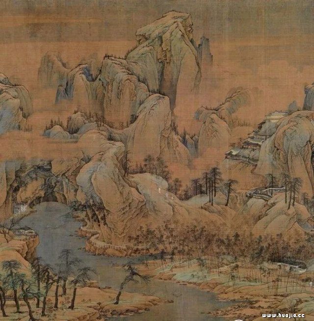 《江山秋色图》作为一幅宋代精品大作,值得我们细细品味。细读此图,作为画中主体的山石峰峦,厥状不一,姿态万方。画法则以流畅多变的细劲墨线空勾轮廓,骨体坚实,并根据山石的脉络略作“小斧劈皴,疏密有致,悉合阴阳。赋色用花青、赭石打底,复以石青、石绿罩染,浓艳处似宝石泛光,莹莹浮动,但大体轻淡,使石青、石绿与花青、赭石呈自然过渡,更不隐去勾皴的墨骨,在层层渲染中,始终保持着线条的清晰度。整幅作品,赋色讲究,崇尚淡雅,别开生面。唐岱《绘事发微》论山石着色有云:“著色之法贵乎淡,非为敷彩喧目,亦取气也;青绿之色本厚,若过用之,则掩墨光以损笔致。以致赭石合绿,种种水色,亦不宜浓,浓则呆板,反损精神。用色与用墨同,要自淡渐浓,一色之中更有一色,方得用色之妙。以色助墨光,以墨显色彩,要之墨中有色,色中有墨,能参墨色之微,则山水中之装饰无不备矣。”观此图,不难悟到这一段画理的妙谛。