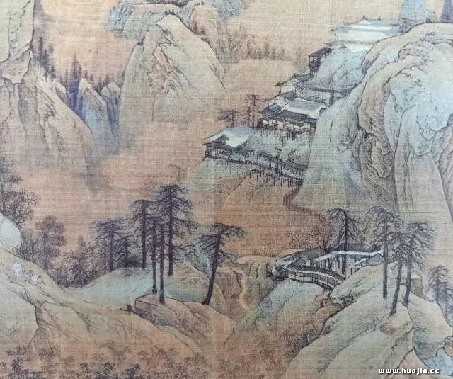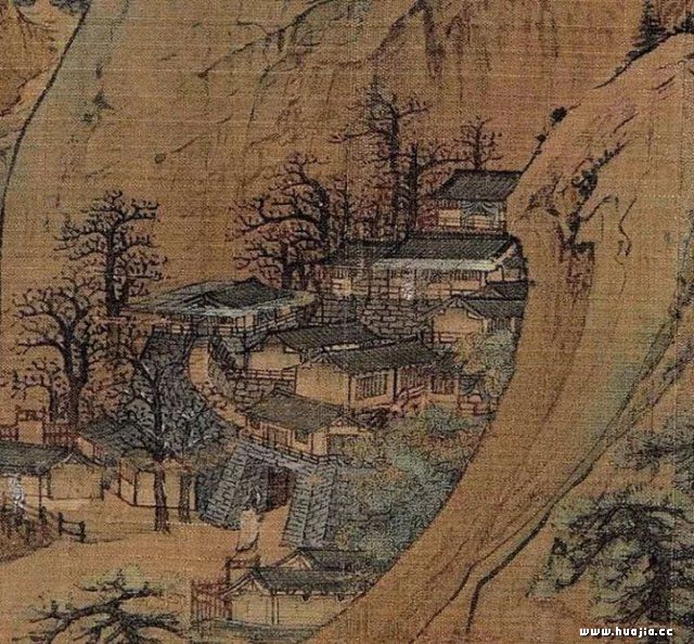 作为山之毛发的树木,以松竹居多。依山起伏,随水抑扬,把山山水水装点的妩媚多姿。画法以双勾作枝干,墨骨点叶,极为生动活泼;作为山石“神采”的烟云,或淡抹天际,或蒸腾弥空,或缭绕山腰,画法以淡墨空勾或黛青烘天衬托而出,显得闲逸舒畅、融怡欲笑。作为掩映在山峦间、竹林中、溪流旁的楼观屋宇、亭榭回廊,或翼然壮丽,或宁谧清幽,既标领了江山胜概,又昭示人们眼前的画中山河可游、可望、可居。画法界画工整,造型精确,石青染瓦,白粉涂壁。对于研究宋代楼台亭阁以及村落的建筑样式,有一定的参考价值。
