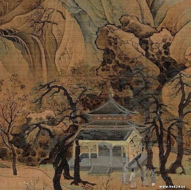 这个山间深潭幽静漂亮。我曾在河南焦作的太行山的云台山的山后,见得此景。那是一个幽深的山谷,山谷尽头是深潭瀑布。幽美静谧,与此景仿佛。此图瀑布左侧,画数人游玩观瀑,人物虽小,但非常生动,我们似乎听到他们面对此景的啧啧称赞声。