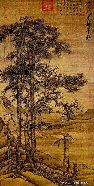 李成(919—967),字咸熙,又称李营丘。李成的一生是在五代十国的动乱岁月中度过的。北宋建国后七年,他溘然醉死于陈州(今河南淮阳)的某客舍,年仅四十九岁。作为一个英年早逝的画家来说,李成的传世作品可谓极为罕见,但他的画作对后世的影响巨大。 李成多画郊野平远旷阔之景,尤以画“平远”与“寒林”之景著称画史。据北宋《宣和画谱》记载,御府所藏李成画作共计一百五十九幅。其中,冠以“平远”画录九幅,冠以“寒林”画录二十四幅,占所藏画作总数百分之二十有余,其余均为描绘春、夏、秋、冬之景。宋人米芾在《画史》中评价:“李成淡墨如梦雾中,石如云动,多巧少真意。”这种“石如云动”的山水笔法,成为后世画家传承李成笔法的重要风格标记。现存《寒林平野图》轴为绢本墨笔,纵137.8厘米、横69.2厘米。现藏台北故宫博物院。在此画的右上角,有宋徽宗赵佶御题“李成寒林平野”六字。前有“御书”半玺,画上端有清乾隆题诗及收藏印鉴,流传有序,应属李成的传世之作。 从这幅《寒林平野图》上看,画面描绘的是萧瑟的隆冬平野景色。近景两株长松亭立,古柏形如苍虬,枝干交柯,老根盘结;中景河道曲折,似冰冻凝固,寒冬萧萧;远景烟霭空蒙而至天际,整幅画面给人一种空灵而又凄凉之感。清人孙承泽在《庚子消夏记》书中,他对《寒林平野图》的极高评价:“古木夭矫,雪色凛冽,寒鸦群集衰草中。暑月展之,如披北风图,令人可以挟扩,非营丘不能也。”这正是对李成最擅长的山水画笔法的诠释。尤其是图中所绘的树枝,无论粗细,均呈弧线曲形,将线条的力度发挥到最大程度,构成了中国古典山水画中最优美的线条。 我们知道,书画同源是中国书画家的独家秘籍,它凸显出中国书画所具有的文化性,不论书家还是画家,都非常注重线条的力度。纵观李成的山水画笔法,可见他将勾线作为表现物象的最主要手段,技法达到了炉火纯青的程度。细品《寒林平野图》中的松针,笔意锐锋给人一种清刚、淡雅的美感,即使不染墨,也神完气足。所以,李成的画仅用淡墨作少量的烘染,同样给人一种秀润淡雅的审美享受。为此,史称李成“惜墨如金”。 史载李成师从荆浩、关仝,但米芾在其《画史》中评:“李成师荆浩未见一笔相似,师关仝则叶树相似。”可见他是后师造化,自成一家,在宋初李成、关仝、范宽“三家山水”中影响最大。可以说,李成之所以能够影响后世,成功之处就在其山水笔法的美感。众所周知,线条是中国绘画艺术的灵魂。李成山水画的笔法灵魂就在其线条之美,其笔法不仅能够表现出烟霭霏雾和风雨明晦的气候变化,浑然也能表现出大自然的山水之灵秀,具有气象萧疏、烟林清旷,毫锋颖脱、墨法精微的特点。正如宋人郭若虚在《图画见闻志》中说:“毫锋颖脱,墨法精微者,营丘之制也。” 李成出身贵族,原籍长安(今西安),先世系唐宗室,祖父于五代时避乱迁家营丘(今山东青州),故又称李营丘。虽然李成的命途多舛,但在家世中衰时犹能以儒道自业,最终在中国山水画史上完成了一次飞跃。同时,他也绝非是一个穷困潦倒的前朝皇族后裔,或是死后成名的大画家。宋人孟元老在《东京梦华录》中描写道:“本铺中两壁皆李成所画山水。”足见他的画作在当时已经闻名天下。不过,明人董其昌在《画禅室随笔》中说:“宋时李营丘画,绝少真迹。”尽管两人的著述文字有相冲之处,但也证明李成生前的名气之高。孟元老著书时,李成已经去世约有一百八十年,董其昌著书时,已距李成作古六百余年,前者是以文学的方式写录,后者则以一个行家的眼光著录。从这个意义上看,李成在世的时候,仿他画的人已经很多。不言而喻,如果李成在当时画坛上默默无名,也不会有人仿他的画。故此,由北宋官方主持编撰的《宣和画谱》评价:“时凡称山水者,必以成为古今第一。”又评:“至本朝李成一出,虽师法荆浩,而擅出蓝之誉,数子之法遂亦扫地无余。”毋庸置疑,李成生前就在同辈山水画家中具有至高的地位。 从李成存世的《寒林平野图》《读碑窠石图》《晴峦萧寺图》《茂林远岫图》等画作来论,在他笔下的自然界中,其风物和花草早已不是什么具体的物象,而是高洁傲岸、坚贞不屈的人格化、精神化、情感化的象征。为此,宋人刘道醇在《宋朝名画评》中对其评价:“成之命笔,惟意所到。宗师造化,自创景物,皆合其妙。”他把李成的画列为神品。李成死后,他的画作更加难得,很多人模仿他的画几乎达到了乱真的程度。从这个侧面,也说明了后世对他画作的爱慕和认同。虽然李成的郊野平远旷阔之景对后世的影响极大,但所谓儒家的“比德”思想也常被功利文人、士大夫所利用,特别是貌是情非的官僚士大夫阶层。