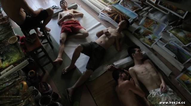 画画的过程更不是享受, 而是无数个通宵地连轴赶工, 一旦碰上加急的订单, 大芬村的夜晚就灯火通明, 男人们赤裸着上身作画, 靠香烟和广播提神。