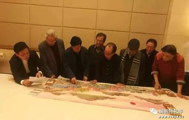 世界政党高层对话会在人民大会堂东大厅召开,一幅题为《构建人类命运共同体携手建设美好世界》(以下简称“建”画)长11.2米,高2.06米的中国画引起社会关注。 有文章赞许这幅画体现了中国的文化自信,也让与会的外国政党领导人充分领略了新时代中国特色大国外交的深厚文化底蕴。有文章则批评这幅作品,格调平庸、笔墨粗糙、色彩艳俗,出现在国家重要场合,这必将成为美术史的笑柄。 “建”画 | 粉气、燥气、草气 据报道,“建”画由中国美协组织完成,中国美协邀请了当代著名美术家张立辰、郭怡孮、杜滋龄、詹庚西、郭石夫、吴悦石、刘大为、冯远、王明明、何家英等11位画家,中国美协分党组书记、驻会副主席徐里担纲总策划同时参与创作。吴悦石担纲了此幅画作的构图构思及小稿绘制并题写跋语。