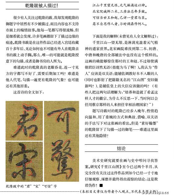 《中国美术报》第90期“新闻时评”曹星原文章《欺君升官打假被打——起底〈千里江山图的伪跋〉》部分文字 我还注意到,但是原跋文说的是禁中文书库,某文作者在他最近受某报邀来解析《江山图》以平息我说这是假画“喧嚣”的这篇文章中却不再提“禁中”二字,难道在我的喧嚣声中,你终于稍加注意发现了“禁中文书库”几个字是这个跋的致命伤吗?我感到很高兴——学术就是这样,面对公共收藏的艺术品鉴定考究不是争高低名分,而是必须把是非说明白,不能误导公众辜负手中公权力。 文中硬伤看不见,绢面上的硬伤也看不见,强词夺理又没说到理上,比如某文的这句话:“有学者觉得蔡京的跋文较短,怀疑被裁。鉴于北宋宣和装的隔水很短,作者不可能题写许多内容。”我微笑,他这是指我。给画做过跋的人都知道怎么面对大纸小绢来起稿子。我没怀疑被裁,而是率直地说这是赤裸裸的伪跋。 如果这不是伪跋,你的王希孟就是女人。