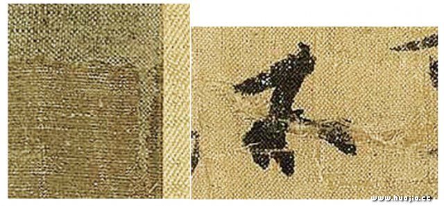 九问:蔡京跋原来在前面? 为了回应我提出蔡跋的损毁状况与所处位置不符,该文作者说:“蔡跋和画幅的两头有许多抓挠的痕迹,这与多次开合卷不当有关,正确的操作方式应该是在桌面上轻轻地滚动开合。这不可能是蔡京留下的,他不至于要如此反复欣赏一个孩子的画。缘由是诸多欣赏者的操作手法比较鲁莽,反复开卷后留下了破损的痕迹。” 请问,哪些欣赏者操作手法比较鲁莽,留下了这样的破损?从这块绢的局部来看,不像是人手抓挠、也不像反复开卷留下的痕迹。如果反复开卷能留下这样深的损伤痕迹,也会留下人手上的油污痕迹。“经过装裱后的古旧字画在流传过程中,由于人们欣赏过程中不断地打开收起,无数次的抚摸,会在表面自然形成一种包浆,光亮平滑,古色古香,主要集中在天头包首部位。”(王旭,徐建光《王氏装裱技艺》) 按某文所说的这件作品在画完后即装裱成类似 “宣和装”样子,蔡京的跋在画卷的前面,因此绢面应该至少像《江山图》的现存开始部分一样,留有明显的旧绢经人手不断抚摸形成的包浆。但是这个跋文所用的绢不但没有包浆而且显得新而生。如果我们把这两块绢并置的话,就可以看出绢面的包浆程度大不相同。