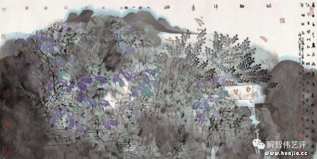 卢禹舜似乎在不伦不类中寻求突破,他的执笔方式也十分搞笑,用写钢笔的方式握毛笔,也许能写好就行,真不知道指、腕、背力如何达成。 古人强调书画用笔有倚伏,开阖籍于阴阳,惊沙坐飞,奔放纵逸,画家激荡的豪情中自带大美山水的自然精神,象卢禹舜这样的无笔性无墨性的作品怎么能代表国家水平,怎么不愧对自己的祖宗。 三、学养 | 非学无以广才 中国画的写意精神来自画家的创作境界,非学无以广才,个人的学养也是直达境界的阶梯。