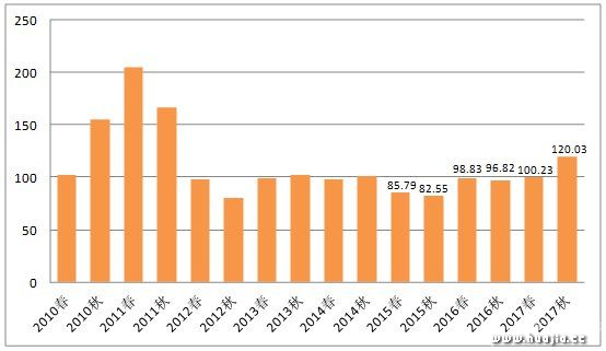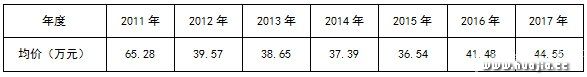 (二)拍品均价 1、拍品均价:达45万 2017年度,10家公司单件拍品成交均价达44.55万元/件(套),较2016年的41.48万元/件(套)再次呈现增长态势。10家公司拍品均价的峰值是在2011年,达65.28万元/件(套)。此后随着市场的下调而下降,至2015年为最低值,是36.54万元/件(套),但近两年随着“减量提质”的经营观念转变,均价呈现持续上升之势。 2011-2017年10家公司单件拍品均价
