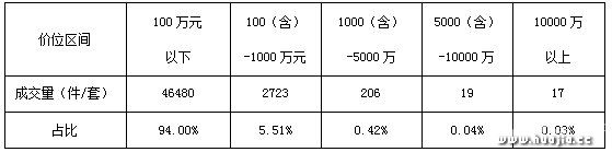 (三)价位结构 1、拍品价位:两极分化 2017年度,10家公司100万元以下拍品数量为46480件(套),占比94.00%,较上年提升0.59个百分点。5000万元以上拍品数量为36件(套),占比0.07%,较上年提升0.02个百分点。 然而,100(含)-1000万元区间成交拍品2723件(套),占比5.51%,1000(含)-5000万元成交拍品206件(套),占比0.42%,均呈下降趋势。拍品价位结构出现了两极分化。 2、亿元拍品:翻一番 2017年度,亿元拍品高达17件(套),成交额共计36.92亿元,占10家公司总成交额的16.76%。无论是数量还是成交金额,均比上年翻一番,也成为了历史以来亿元拍品最多的一年。 2017年10家公司成交拍品价档区间分布