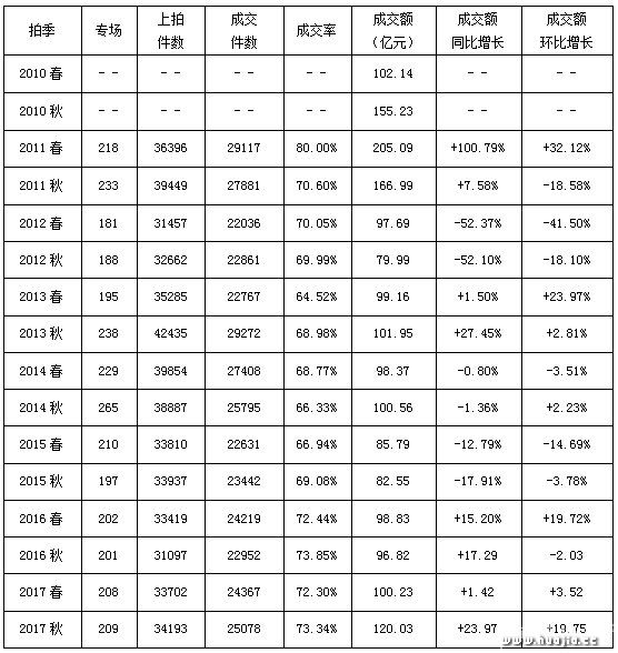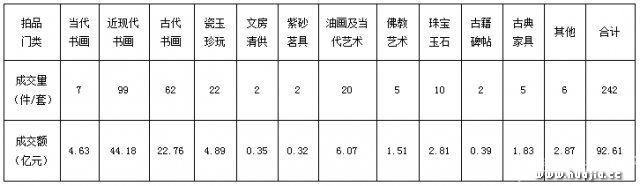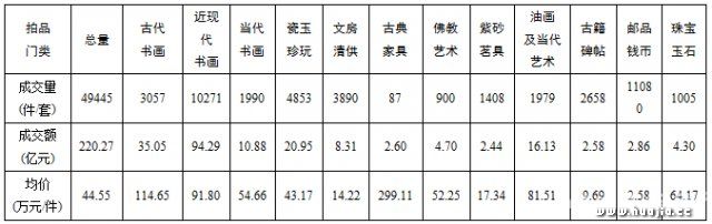 (二)中国书画:增长13% 2017年度,10家公司共举办中国书画拍卖152个专场,上拍20262件(套),成交15318件(套),成交率75.60%,成交额140.21亿元。较上年成交量增加605件(套),成交额增长13.21%。 古代书画:2017年度,10家公司共推出古代书画专场33个,上拍4430件(套),成交3057件(套),成交率69.01%,成交额35.05亿元,较上年成交量基本持平,但成交额下降了25.07%。这主要由于高价位古代书画作品在流通市场中可遇不可求,年度内千万级古代书画作品较上年减少了10件(套)。 近现代书画:2017年度,10家公司共推出近现代书画专场98个,上拍13556件(套),成交10271件(套),成交率75.77%,成交额94.29亿元,较上年成交量增加416件(套),成交额增长了24.33%。年度内成交额在五千万元以上的近现代书画作品竟达15件(套),其中8件(套)在亿元以上。 当代书画:2017年度,10家公司共推出当代书画专场21个,上拍2276件(套),成交1990件(套),成交率87.43%,成交额10.88亿元,成交量基本与上年持平,但成交额增长90.21%。主要原因是年度内共有五件(套)崔如琢作品成交过千万,共计4.43亿元(其中两件过亿)。剔除该因素,当代书画的增长并非乐观,但年度内过百万的作品已从上年的83件(套)增长到131件(套)。 (三)珠宝玉石、信札手稿、古典家具、油画及当代艺术、邮品钱币:较大增长 珠宝玉石:2017年度,10家公司共推出珠宝玉石专场15个,上拍1929件(套),成交1130件(套),成交率58.59%,成交额7.25亿元,较上年成交量增加252件(套),成交额增长75.12%。 信札手稿:2017年度,10家公司共推出信札手稿专场14个,上拍2898件(套),成交2256件(套),成交率77.85%,成交额2.06亿元。较上年成交量减少219件(套),但成交额增长49.30%。 古典家具:2017年度,10家公司开设古典家具专场6个,上拍163件(套),成交87件(套),成交率53.37%,成交额2.60亿元;较上年成交量减少60件(套),但成交额增长34.02%,且有5件拍品成交过千万元。其中北京保利推出的一对御制黄花梨鸾凤牡丹纹大顶箱柜成交9890万元,创下了古典家具的拍卖纪录。 油画及当代艺术:2017年度,10家公司共推出油画及当代艺术专场32个,上拍2612件(套),成交1979件(套),成交率75.77%,成交额16.13亿元。较上年成交量减少170件(套),但成交额增长30.40%。中国嘉德推出的陈逸飞《玉堂春暖》以1.49亿元成交。 邮品钱币:2017年度,10家公司共推出邮品钱币专场22个,上拍13981件(套),成交11080件(套),成交率79.25%,成交额2.86亿元;较上年成交量增加了1127件(套),成交额增长24.35%。 (四)文房清供、古籍碑帖、瓷玉珍玩:基本平稳 文房清供:2017年度,10家公司共推出文房清供专场38个,上拍5128件(套),成交3765件(套),成交率73.42%,成交额5.35亿元;较上年成交量增加39件(套),成交额增长14.07%。其中,西泠拍卖和上海朵云轩两家公司共计有22个专场,成交2.91亿元。 古籍碑帖:2017年度,10家公司共推出古籍碑帖专场13个,上拍3550件(套),成交2658件(套),成交率74.87%,成交额2.58亿元,较上年成交量减少3726件(套),成交额增长3.20%。 瓷玉珍玩:2017年度,10家公司共推出瓷玉珍玩专场51个,上拍8250件(套),成交4853件(套),成交率58.82%,成交额20.95亿元;较上年成交量增加916件(套),成交额下降7.63%。其中北京保利两季度均推出的“玫茵堂暨欧美搜储康熙、雍正御窑精华”专场共取得2.45亿元的成绩。 (五)宫廷艺术、紫砂茗具、佛教艺术:较大下降 宫廷艺术:2017年度,10家公司共推出宫廷相关艺术专场16个,上拍783件(套),成交526件(套),成交率67.18%,成交额11.63亿元;较上年成交量增加47件(套),成交额下降27.72%。 紫砂茗具:2017年度,10家公司共推出紫砂茗具相关专场14个,上拍2031件(套),成交1408件(套),成交率69.33%,成交额2.44亿元。较上年成交量增加120件(套),成交额下降41.06%。 佛教艺术:2017年度,10家公司共推出佛教相关艺术专场15个,上拍1474件(套),成交900件(套),成交率61.06%,成交额4.70亿元;较上年成交量减少161件(套),成交额下降48.58%。 二、拍品结构 (一)门类结构 1、中国书画:占比64% 2017年度,10家公司中国书画成交额占比63.66%,与上年基本维持稳定。但居首位的近现代书画占比42.81%,较上年提升6.34个百分点。古代书画占比15.91%,较上年下调8个百分点。当代书画占比4.94%,较上年提升2.02个百分点。 2、油画及当代艺术、珠宝玉石:占比提升超过1% 2017年度,油画及当代艺术成交额占比7.32%,珠宝玉石成交额占比3.29%,均较上年提升超过1个百分点。主要原因是此两个门类在年度内均出现1件(套)亿元以上拍品。 3、瓷玉珍玩:占比下降2% 2017年度,瓷玉杂项成交额占比9.51%,较上年的11.59%下降了2个百分点,下降幅度仅次于古代书画。值得注意的是,2017年国内瓷器拍卖的下降与香港地区的高价频出形成强烈反差,国内瓷器市场仍有待进一步加强。 4、其他门类:基本稳定 2017年度,文房清供成交额占比2.43%,古典家具成交额占比1.18%,古籍碑帖成交额占比1.17%,邮品钱币成交额占比1.30%,与上年相比,均表现稳定。 2017年度10家公司成交拍品结构