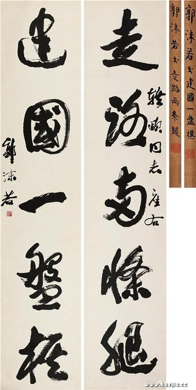 郭沫若 行书五言巨联 (2)古代书画精彩纷呈 2017年度,古代书画1000万元以上拍品有62件(套),仅5000万元以上拍品达14件(套),并有赵孟頫、唐寅、石涛、梁楷、徐渭、吴彬、沈周、张宗苍、唐岱、赵之谦等多位古代书画家刷新了个人拍卖纪录。 古代书画主要拍品有: 北京保利推出的赵孟頫行书《般若波罗蜜多心经》以1.91亿元成交,刷新赵孟頫作品拍卖纪录,此作被甘肃天庆博物馆竞得。 中国嘉德推出的南宋四帝御笔《四朝宸翰》手卷以1.49亿元成交,本卷曾经伍元蕙、潘延龄、程琦递藏,曾在2012年纽约苏富比亚洲艺术周上以568.25万美元成交。 中国嘉德推出的沈周《送吴文定行图并题卷》以1.48亿元成交,创其作品拍卖纪录。 中国嘉德推出的徐渭《写生卷》以1.27亿元成交,创其作品拍卖纪录。该作是《石渠宝笈》著录的徐渭作品中至今仍在市场流通的唯一一件。