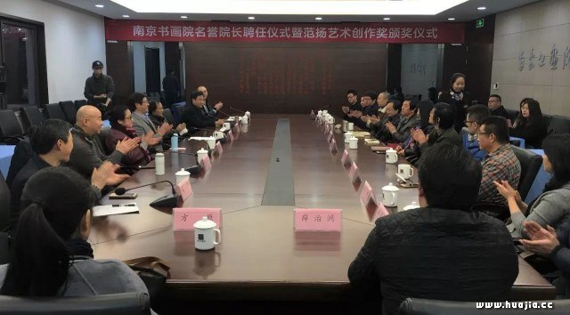 南京书画院名誉院长聘任仪式暨范扬艺术创作奖颁奖仪式现场 2017年12月10日下午,南京书画院名誉院长聘任仪式暨范扬艺术创作奖颁奖仪式在南京书画院举行。南京市文广新局局长刁仁昌;南京书画院原院长、南京市政协书画院院长朱道平;中国书协副主席、江苏省书法家协会主席孙晓云;南京书画院原院长、中国国家画院国画院副院长范扬;南京书画院院委会委员、南京政协书画院副院长姚媛;南京书画院院务委员张建华;南京书画院院委会委员兼花鸟画研究所副所长赵怡文等南京书画院全体画家出席了仪式。仪式主持人由南京市文广新局巡视员顾小荣担任,南京书画院院长刘灿铭宣读了南京书画院关于聘任名誉院长的决定并宣布了范扬艺术创作奖的名单。刁仁昌局长分别为朱道平、孙晓云、范扬颁发名誉院长聘书。受聘名誉院长朱道平、范扬为范扬艺术创作奖获奖者杨运高、詹勇颁发证书。随后,名誉院长朱道平、孙晓云、范扬先后发表主题讲话,以及获奖代表杨运高发表获奖感言。 对于南京书画院此次聘任名誉院长,刘灿铭表示,朱道平、孙晓云、范扬三位艺术家先后担任画院领导职务,他们极具创造精神,在书画艺术领域做出了突出的贡献,在业内的成就有目共睹,在中国书画界享有崇高的地位及声誉,为画院赢得了荣誉。此次特聘请朱道平、范扬、孙晓云三位艺术家为南京书画院名誉院长,是为了弘扬中华民族优秀的传统文化,繁荣中国书画艺术,加深和巩固书画院前辈艺术家与画院的深厚友情,对画院给予更多的关爱扶持,传承南京书画界的优良传统。在艺术家前辈与优秀艺术家新秀的共同努力下,南京书画院的艺术家们将多出精品力作,反映优秀传统文化和人民生活,创作出无愧于时代、无愧于祖国和人民的作品。 据介绍,范扬艺术创作奖是南京书画院首次设立的奖项,该奖项是名誉院长范扬先生在南京书画院(金陵美术馆)任职以来的全部工资所得如数捐出,作为“范扬艺术创作奖”专项资助资金来源,用于鼓励南京书画院50岁以下在职书画家中近5年来创作成绩优秀、学术上有建树的艺术家。该奖项评审会由顾小荣担任主任,朱道平、范扬、刘灿铭、陈新建任委员。