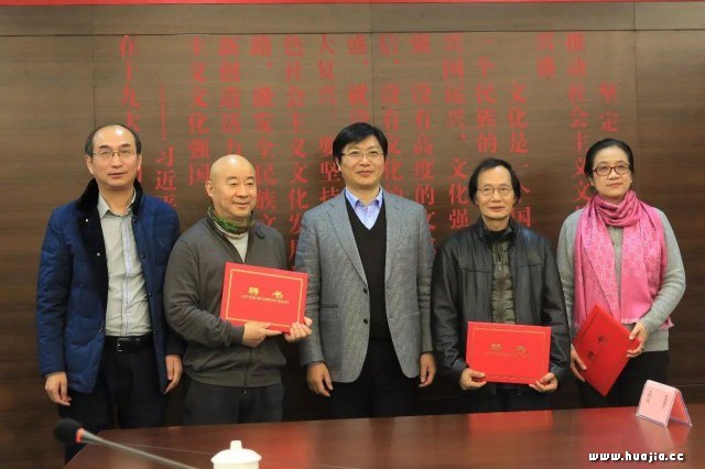 刁仁昌局长(中)为朱道平(右二)、孙晓云(右一)、范扬(左二)颁发名誉院长聘书合影