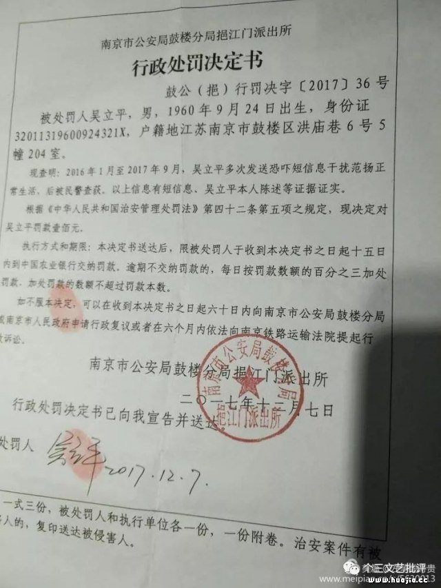 对吴立平来讲,2017年是恶运缠身的一年,因包装范扬欠下巨额债务,7次当了被告,因无法偿还债务,被法院关押1个月。更让吴立平想不到的是,他又因为范扬以遭短信恐吓的名义举报,于2017年12月7日,被南京市公安局鼓楼分局挹江门派出所处以行政处罚100元。