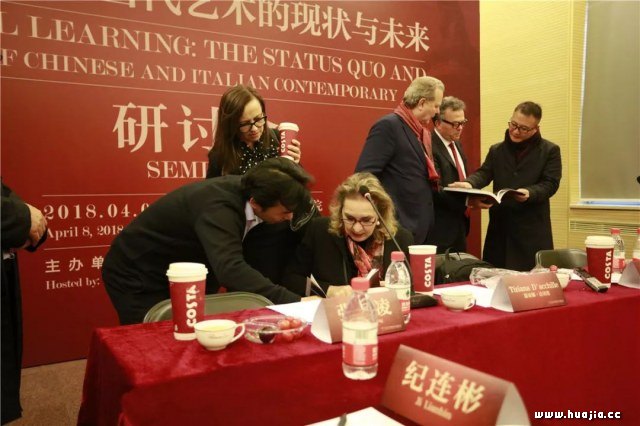研讨会现场 参加此次研讨会的意方代表包括:佛罗伦萨美术学院院长克劳迪奥·洛卡(Claudio Rocca)、罗马美术学院院长提亚娜·达切莲(Tiziana D’Acchille)、米兰布雷拉美术学院院长弗兰科·马洛克(Franco Marrocco)以及著名艺术家瓦莱里亚·坎比。