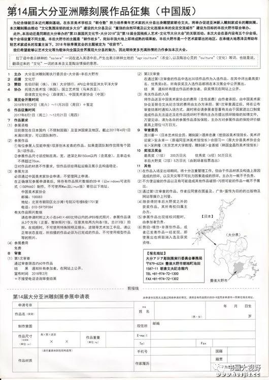 展出日期:2018年7月-8月 展出地点:石家庄及河北省部分地市 展出规模:展出入选作品260件。 作者待遇: 1、评选出的入选作品前60件作品的作者具备申请加入中国美协会员的一次条件。 2、入选作品前60件(税前中国画收藏费:15000元/件、油画收藏费:18000元/件),作品由组委会收藏。其余入选作品200件展览结束后一个月内退还作者。 3、出版画册,每位参展作者均可获赠一本。 4、向参展作者颁发证书。 收作品照片时间:2018年5月31日止,以收到地邮戳为准。 收件地址:北京市朝阳区北沙滩一号院32号楼A座710,邮编:100083 收件人:王晓丹 联系电话:(010)59759379 三十、“江海门户通天下”——全国中国画作品展 展出时间:2018年4月 展出地点:江苏省海门市 展出规模:展出入选作品260件 作者待遇: 1、评选出的入选作品前60件作品的作者具备申请加入中国美协会员的一次条件。作品由组委会收藏。(税前收藏费:15000元/件) 2、出版画册,每位参展作者均可获赠一本。 3、向参展作者颁发证书。 收作品照片时间:2018年3月5日止,以收到地邮戳为准。 收件地址:北京市朝阳区北沙滩一号院32号楼 B座1712,邮编:100083 收件人:赵昆(海门国画展) 联系电话:(010)59759687 三十一、首届中国(深圳)国际水彩画双年展 展出日期及地点: 首展日期:2018年4月 首展地点:罗湖美术馆 全国巡回展时间、地点将于首展结束后公布。 展出规模:展出入选作品不超过260件。 作者待遇: 1、评选出的前60件入选作品的作者(中国公民)具备申请加入中国美协会员的一次条件。 2、出版画册,每位参展作者均可获赠一本。 3、向参展作者颁发证书。 收作品照片时间:2018年1月26日24:00时止,以收到地邮戳为准。 收件地址:北京市朝阳区北沙滩一号院32号楼B座1712室,邮编:100083 收件人:赵昆(深圳水彩国际双年展) 联系电话:(010)59759687 三十二、第14届大分亚洲雕塑展