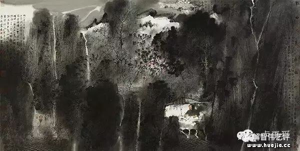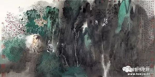 (卢禹舜作品) 卢禹舜在他多年的创作中,他以大面积的皴擦和渲染创造他的“卢式山水”,然后画面开一个小窗,里面安置一个古人就是唐诗意象,里面硬性嵌入一个领袖人物就是“乾坤大义”。 卢禹舜“乾坤大义”系列作品里的主席形象,黑、怪、乱、丑,让人喷饭。是不是我们眼拙,看不到卢禹舜作品在传统山水画中的现代语言的转换,是不是我们耳背,听不到“乾坤大义”的画面有井冈山、延安、韶山的民歌的旋律。