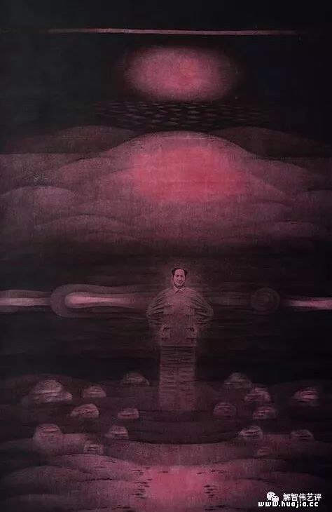 (卢禹舜作品) 精神崇高力的缺失。卢禹舜选择领袖题材的创作,作品却显得精神苍白,一是把人物与自然的关系理解得太肤浅,看不出一个领袖的心胸与天地精神的深层联系;二是曲解领袖的精神形象,用低级的造神方式,类如耶稣诞生的图式把领袖推向了新的神坛。