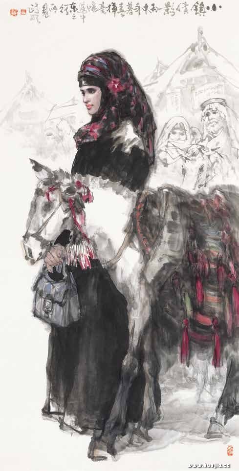 陈政明《小镇倩影》,中国画,138cm×68cm,2016